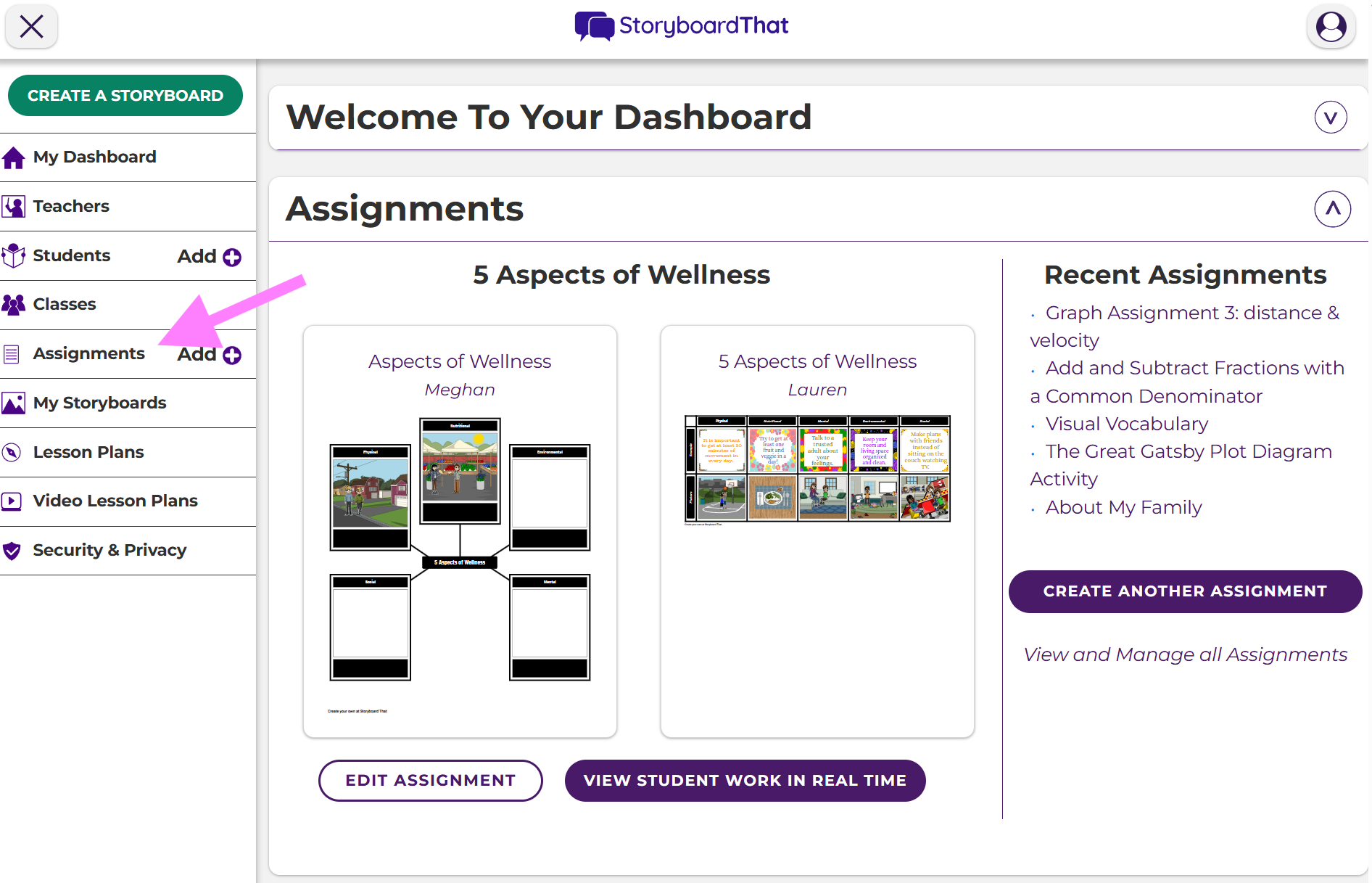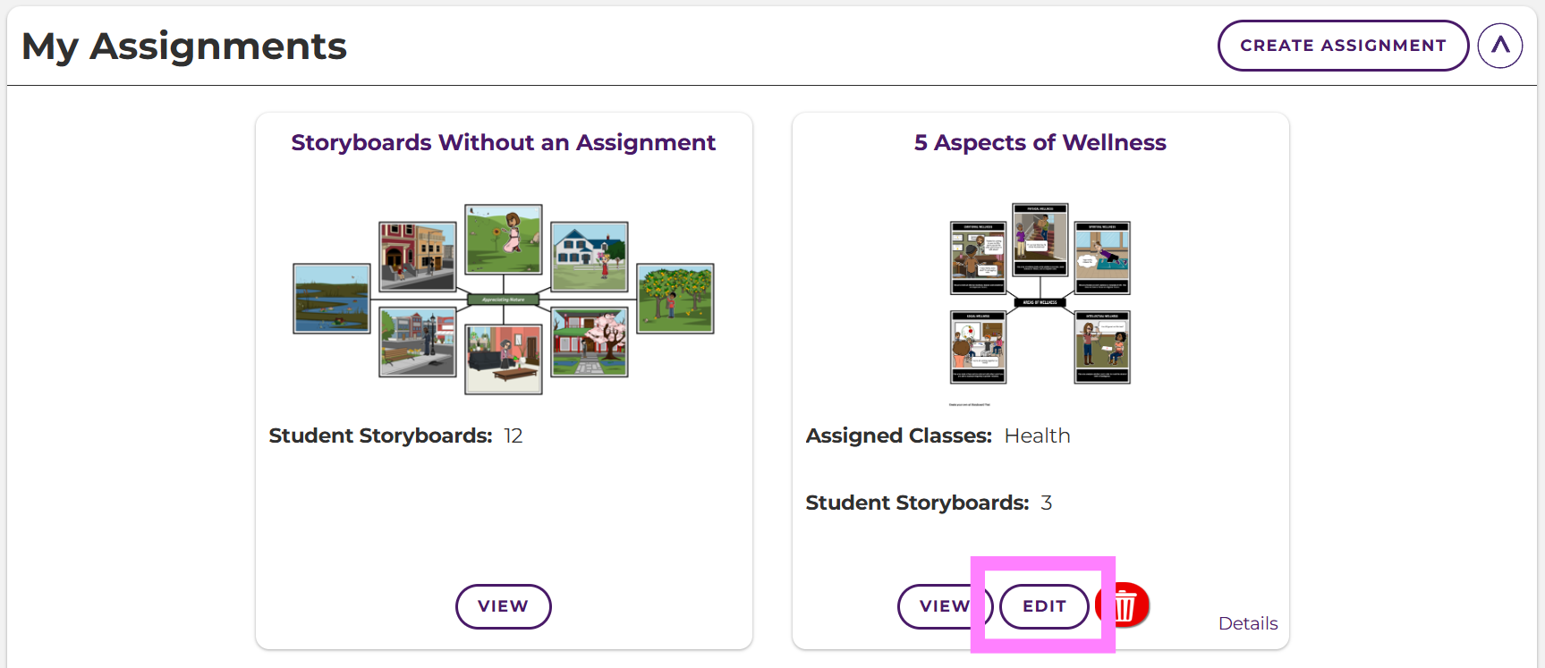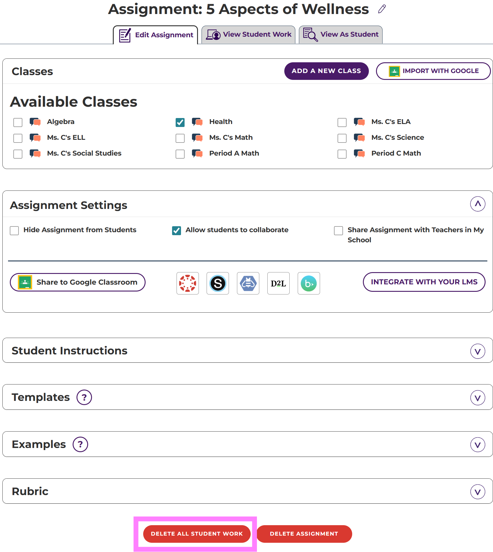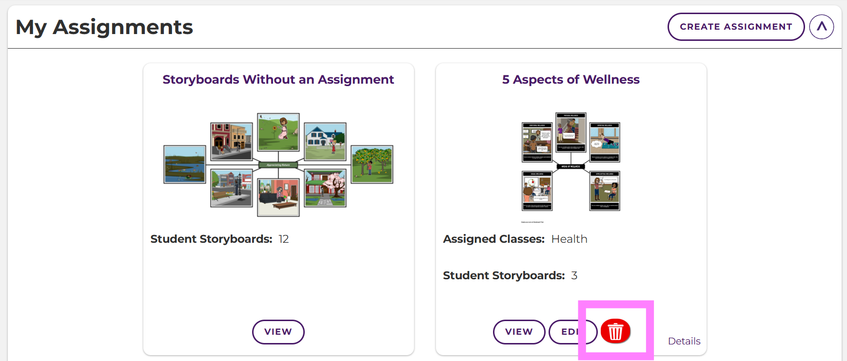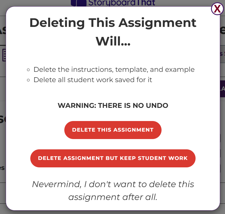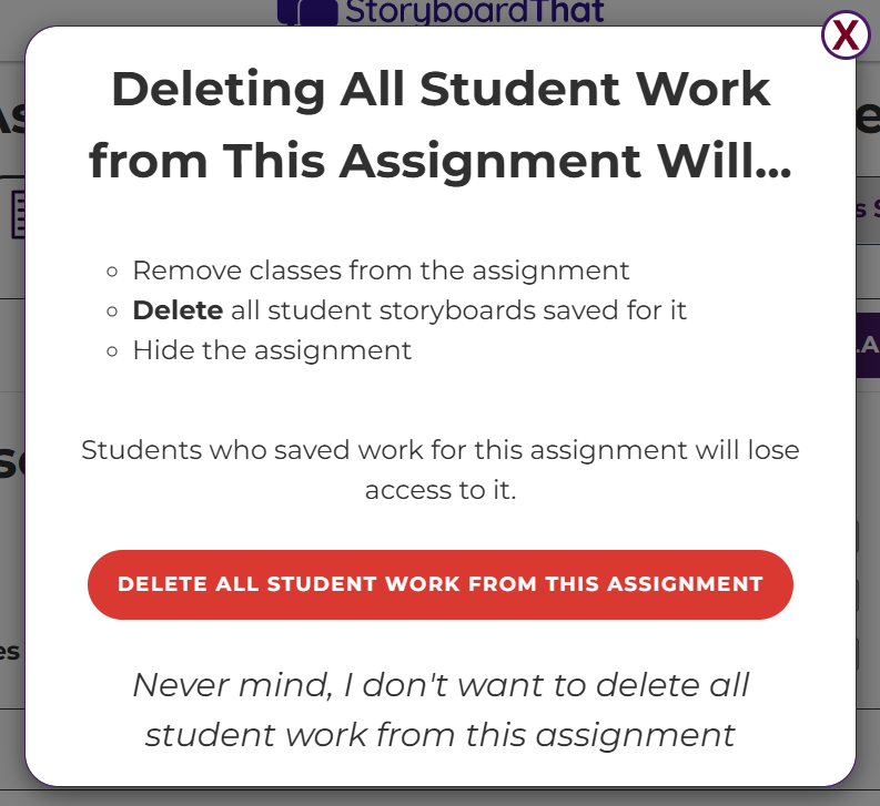 If you want to keep the assignment in place and just want to delete the student storyboards, you can click on the Delete All Student Work button.