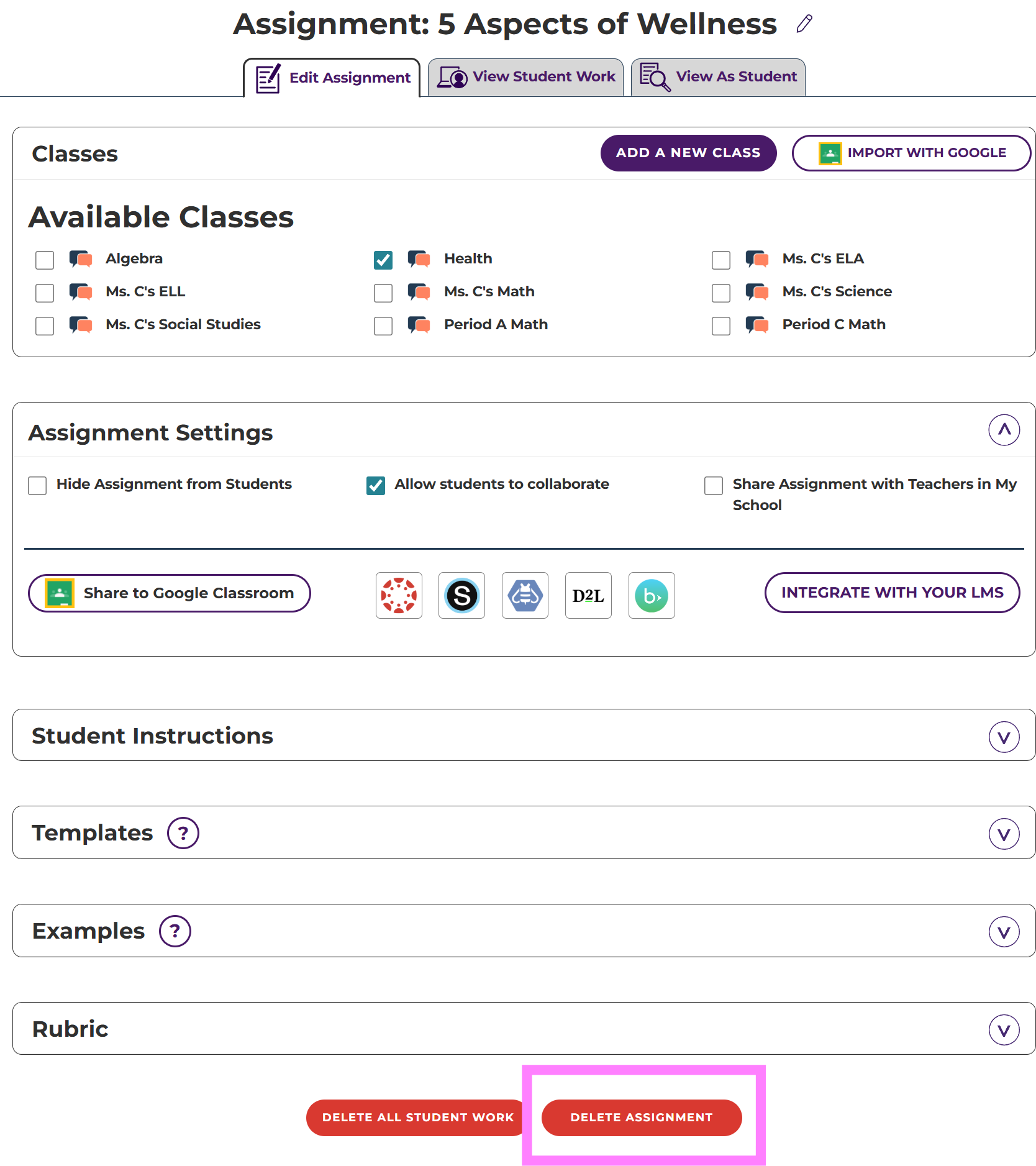 To delete an assignment, go to the Edit Assignment tab of the desired assignment and click the Delete Assignment button. There are also options to Hide Assignment and Delete All Student Work.