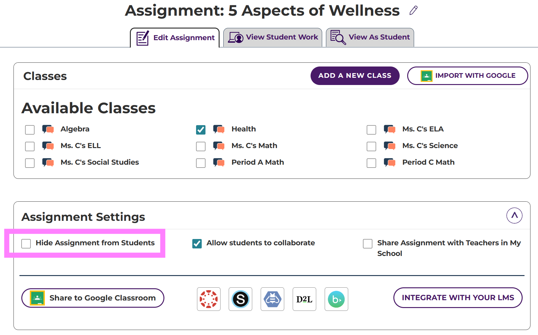 If you are not ready for your students to see the assignment, you can choose to hide the assignment.Ā