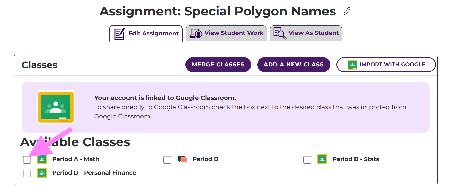 - After creating the assignment, share the assignment to Google Classroom by going to the Edit Assignment page and checking the box next to the class you want to assign it to.