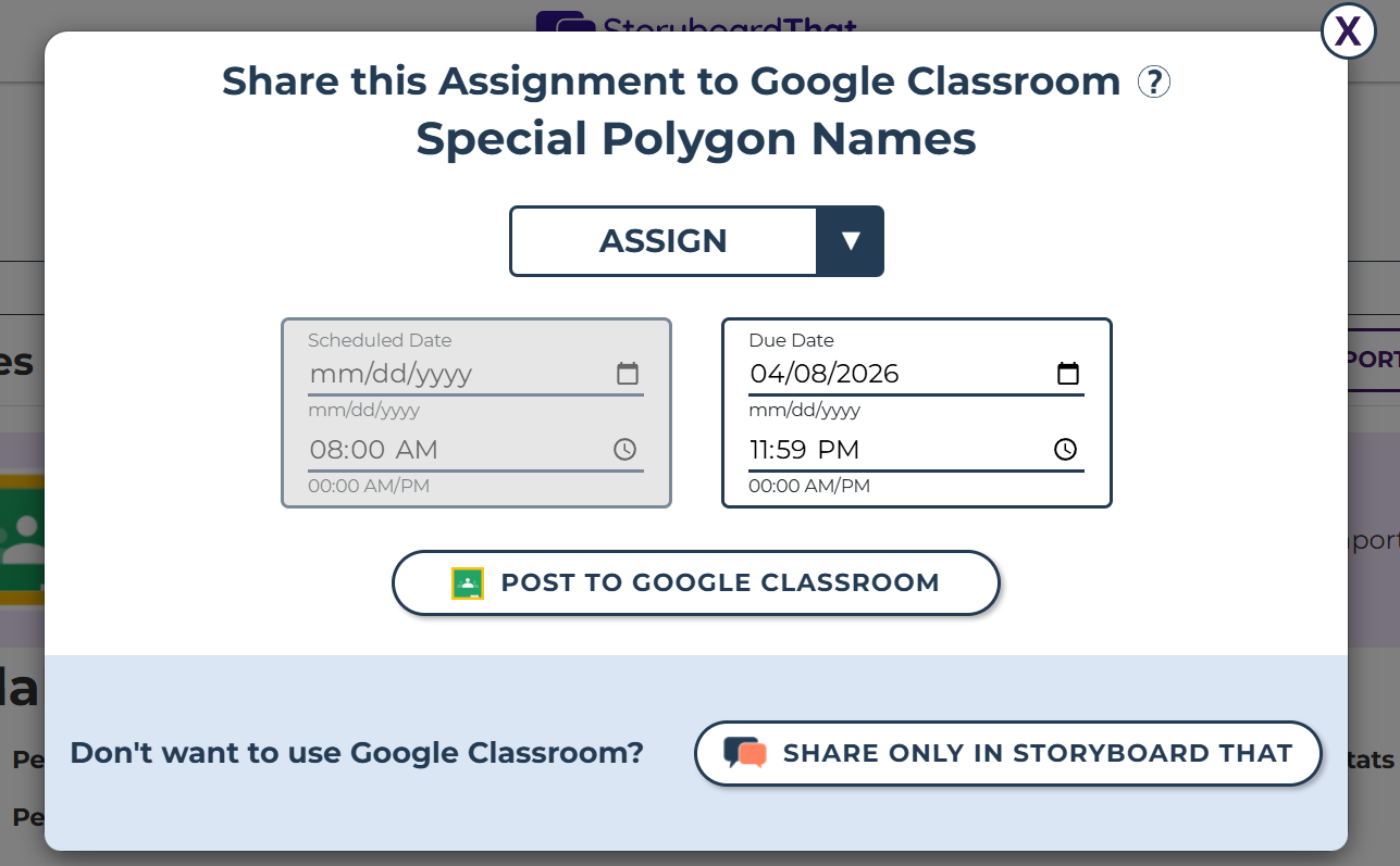 - A pop-up will appear if you are linked with Google Classroom. Assign or schedule when you would like the assignment to post.