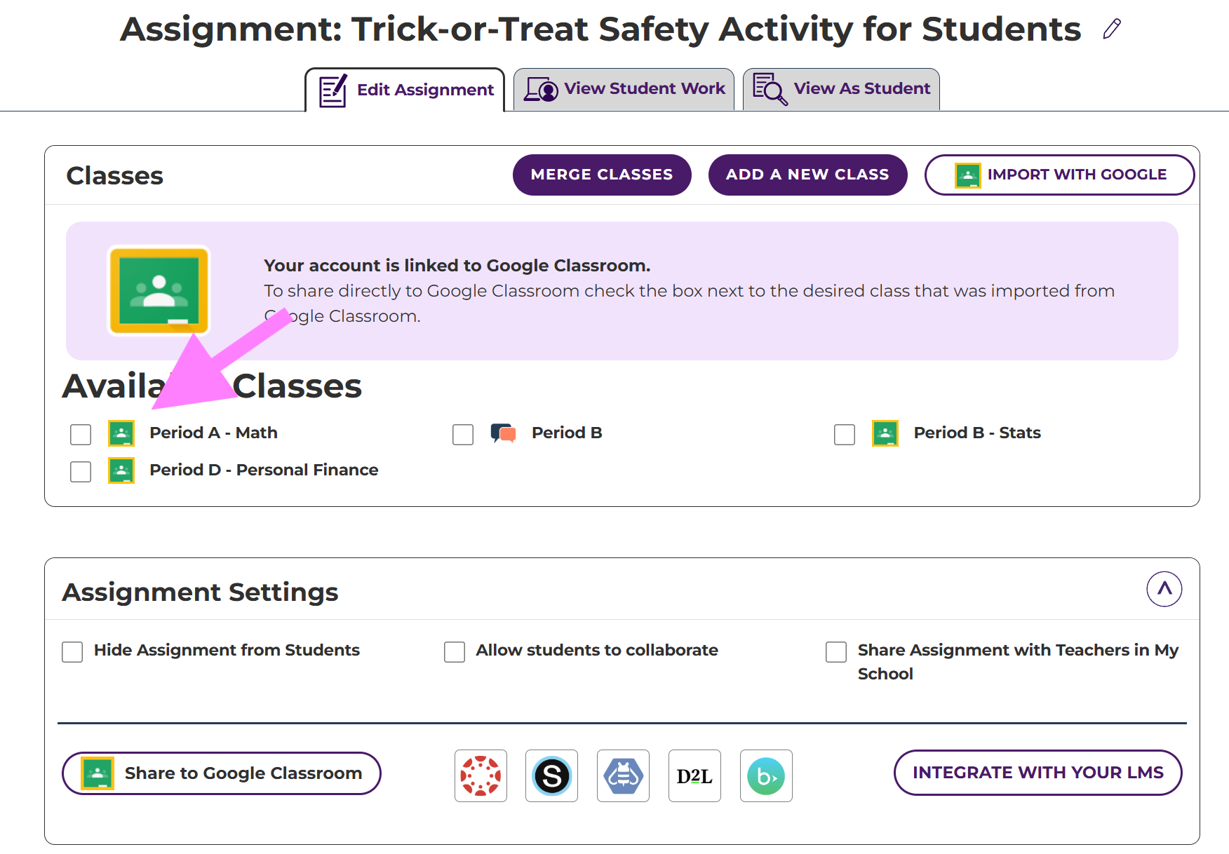 - On the Edit Assignment tab, click the checkbox next to the class(es) you want to share the assignment to.