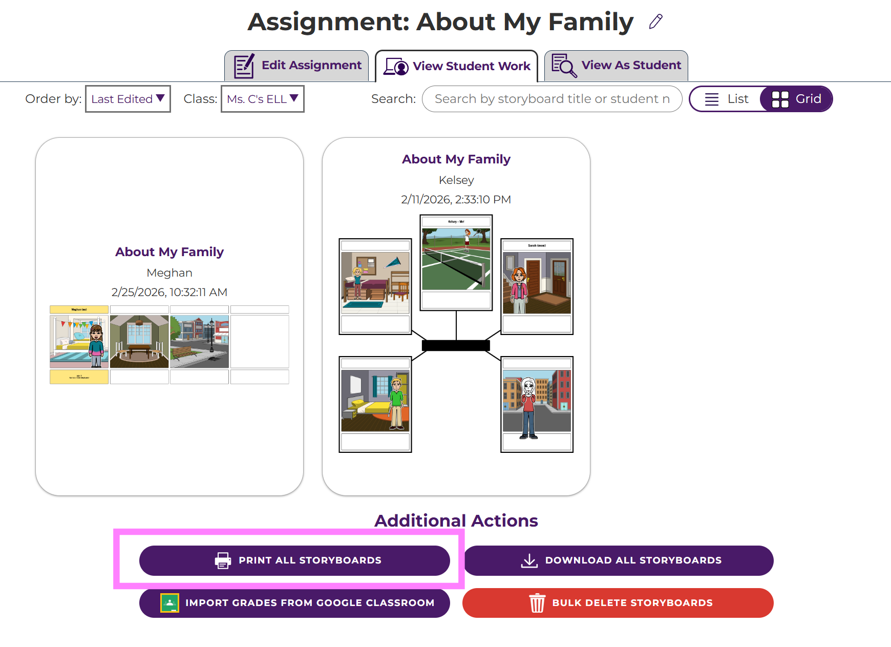 Want to post your student's work on the bulletin boards at school or have a hard copy for portfolios and grading? You can print all storyboards in an assignment with just the click of a button!