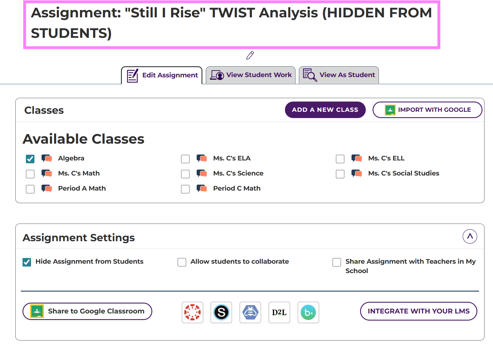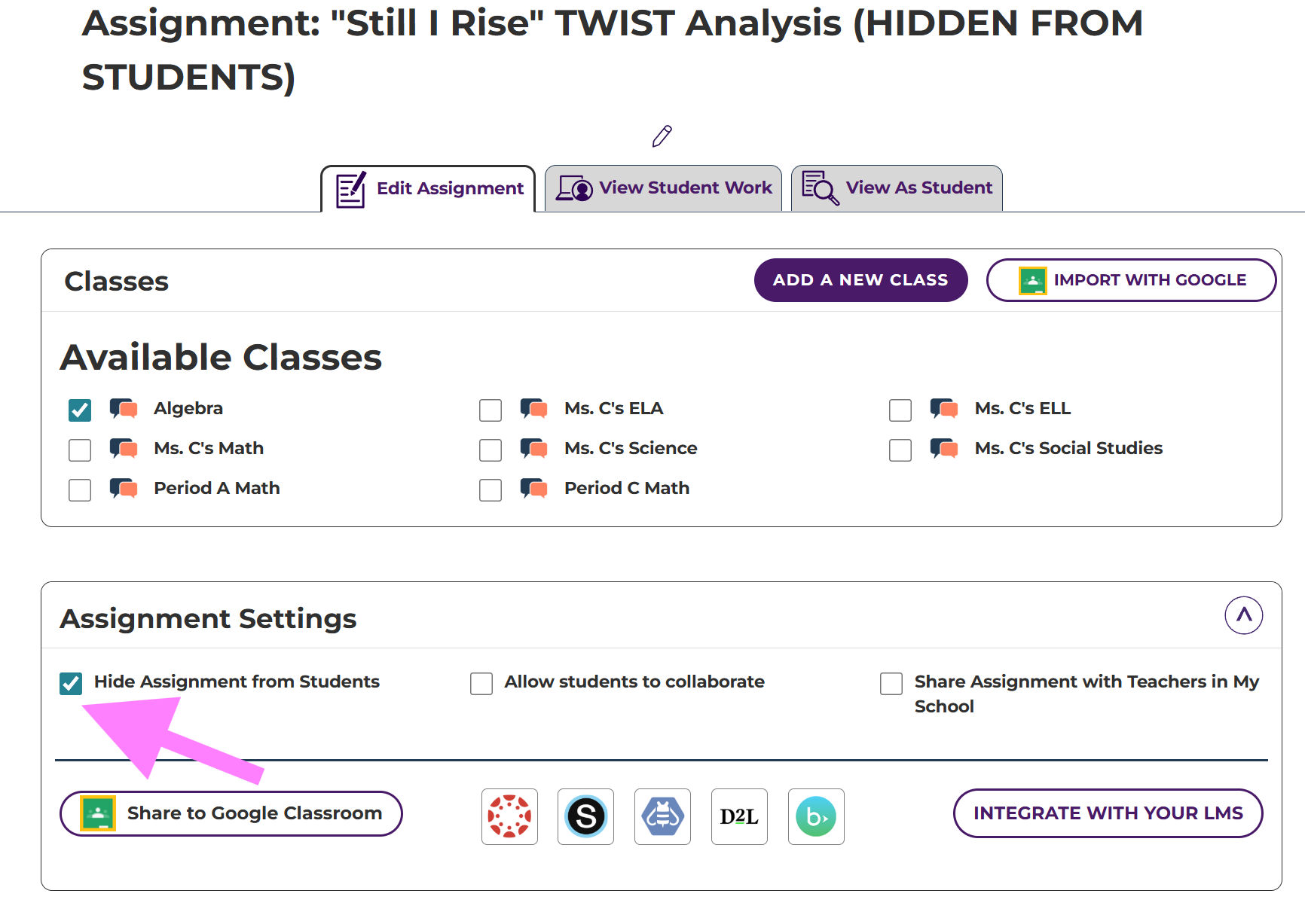 Teachers can hide assignments if they don't want students to see them yet. This helps teachers plan ahead or edit the assignment across several sittings. Hiding assignments will prevent students from submitting or editing work.