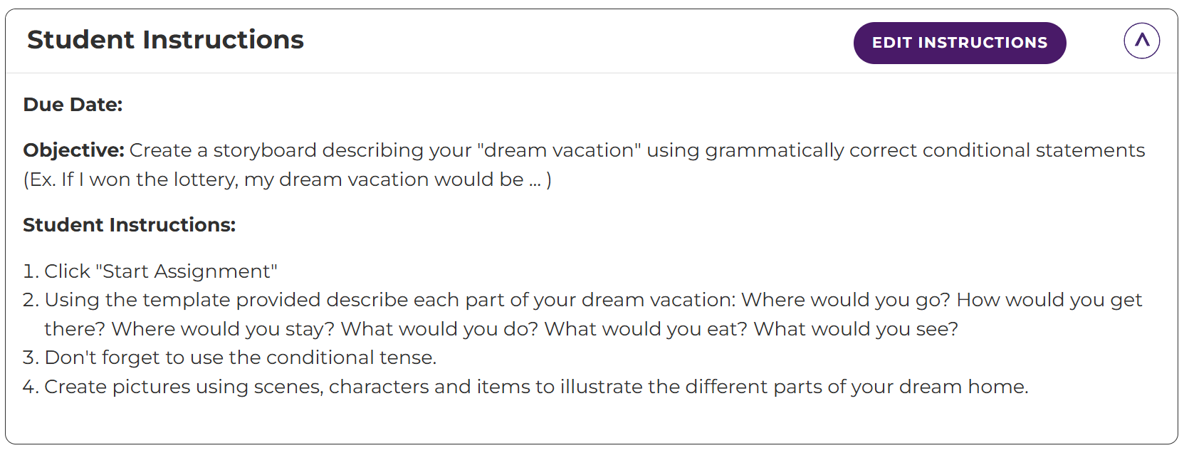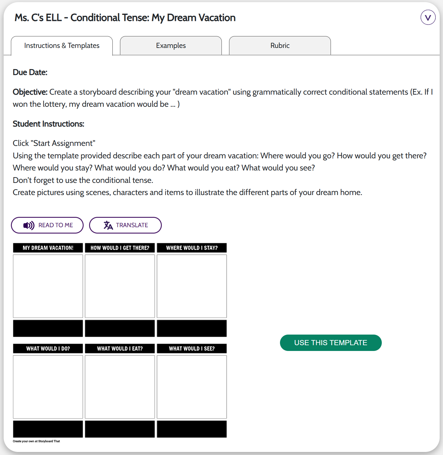 This is what the Student Dashboard looks like! Students will click the "Start Assignment" button to open the Storyboard Creator and start working!