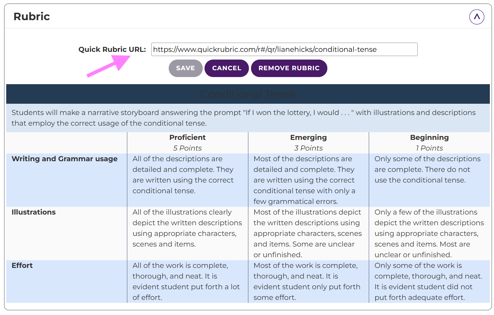 Add a Quick Rubric URL to show criteria for grading/expectations.