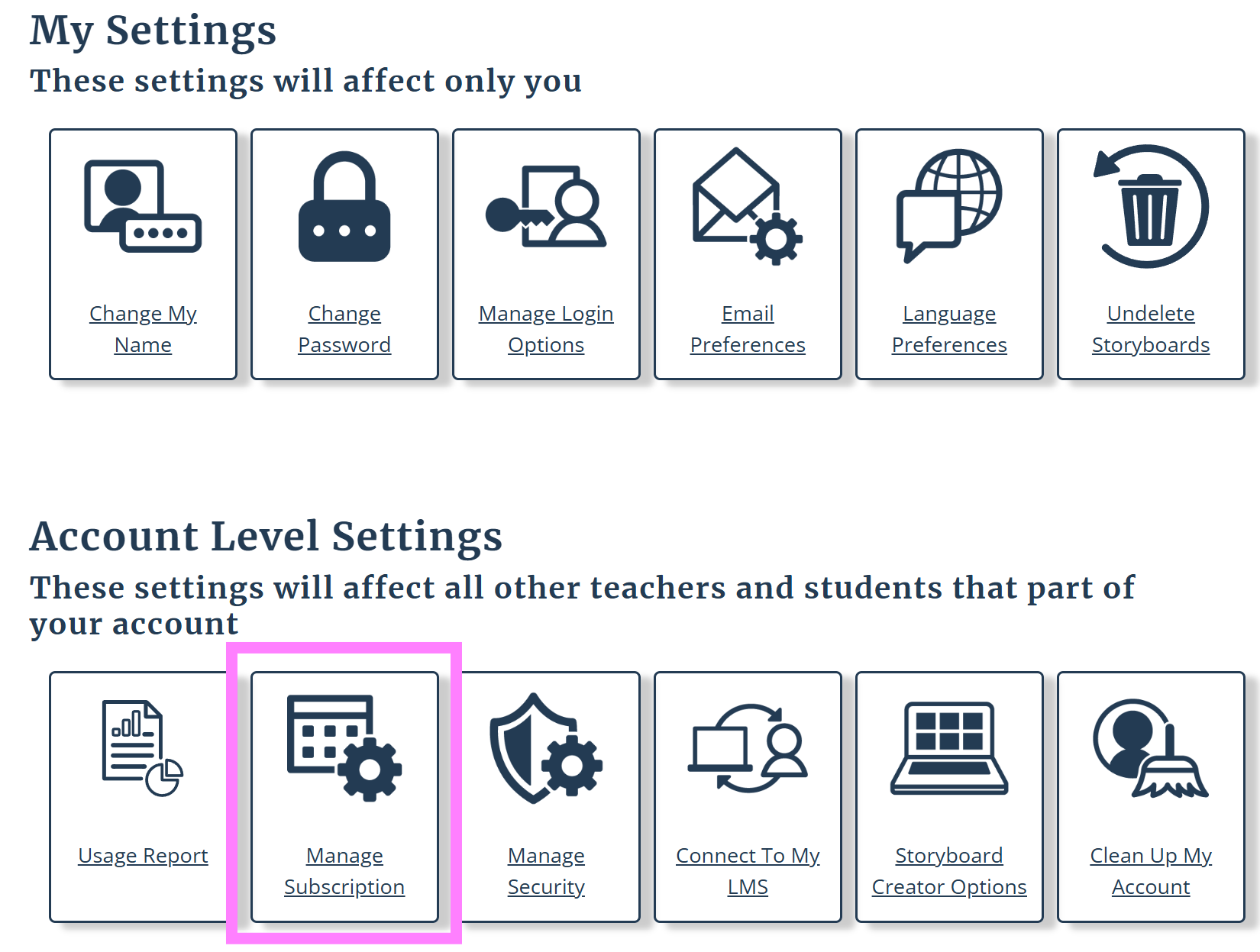 Cancel your paid subscription to Storyboard That under Manage Subscription.