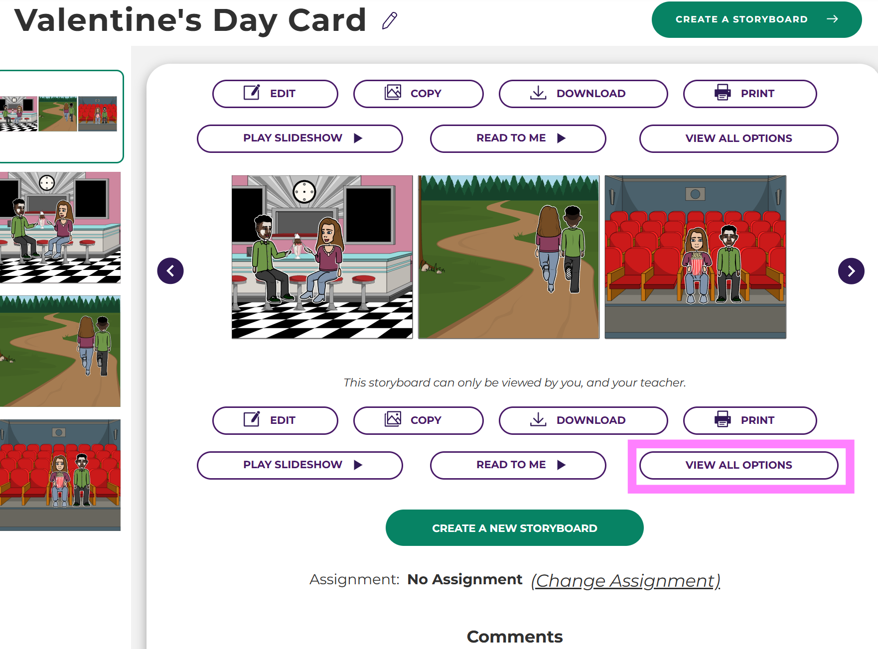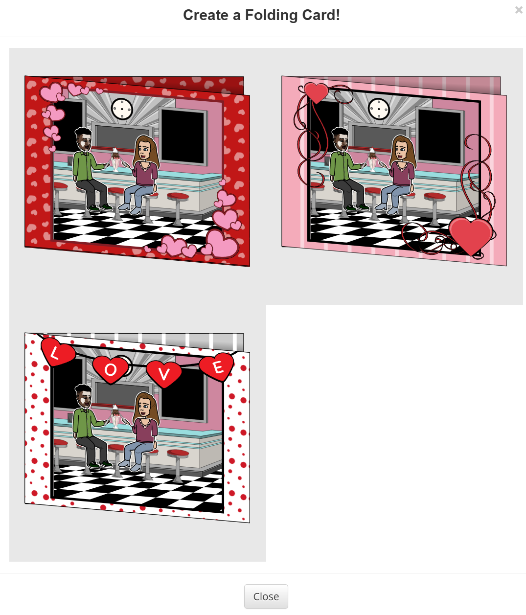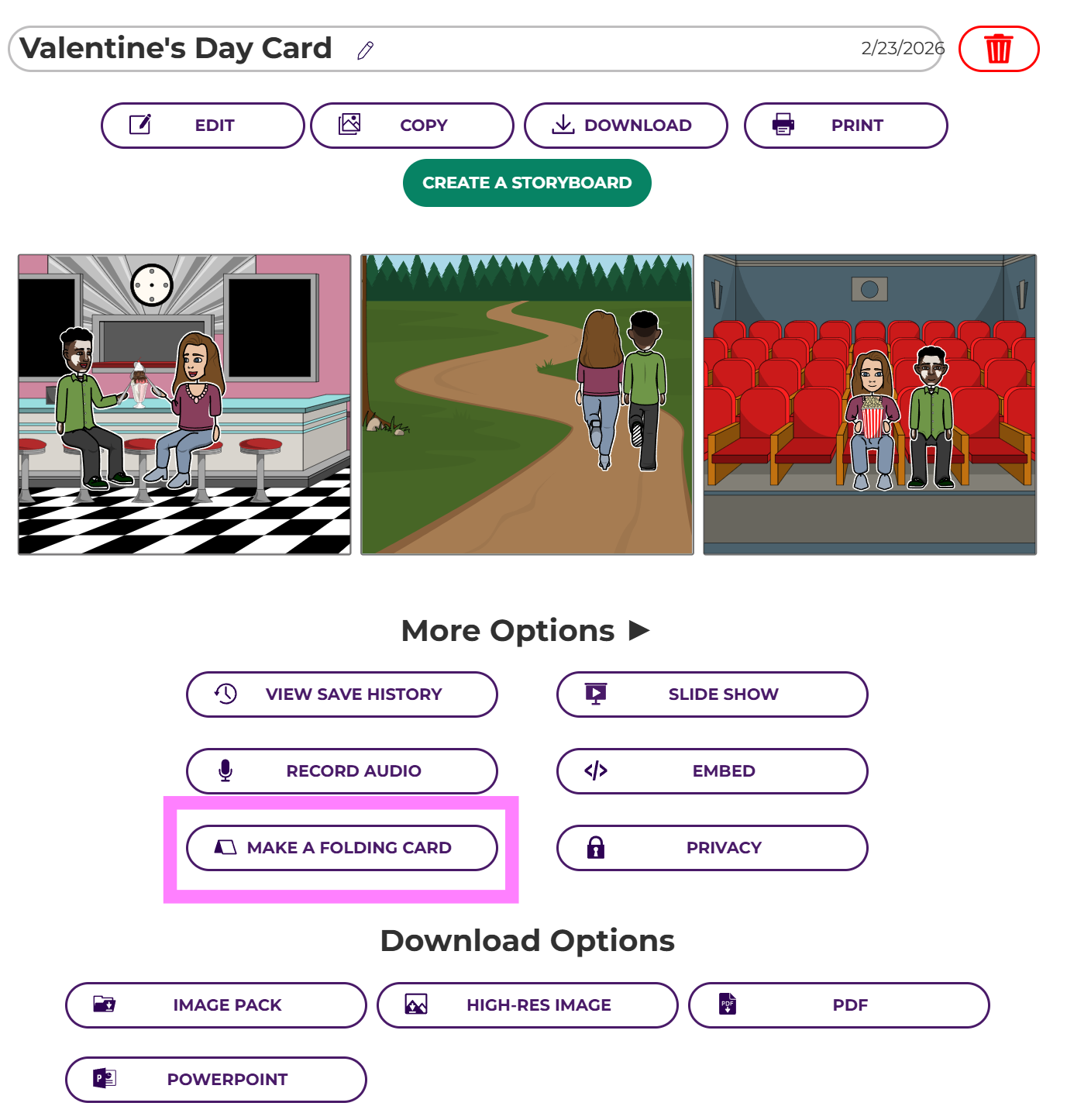 Storyboards of any layout can be converted into a folding card, but only the first three cells will appear. Titles and descriptions are not printed on the card, so use text boxes inside the cell if you want to include text.