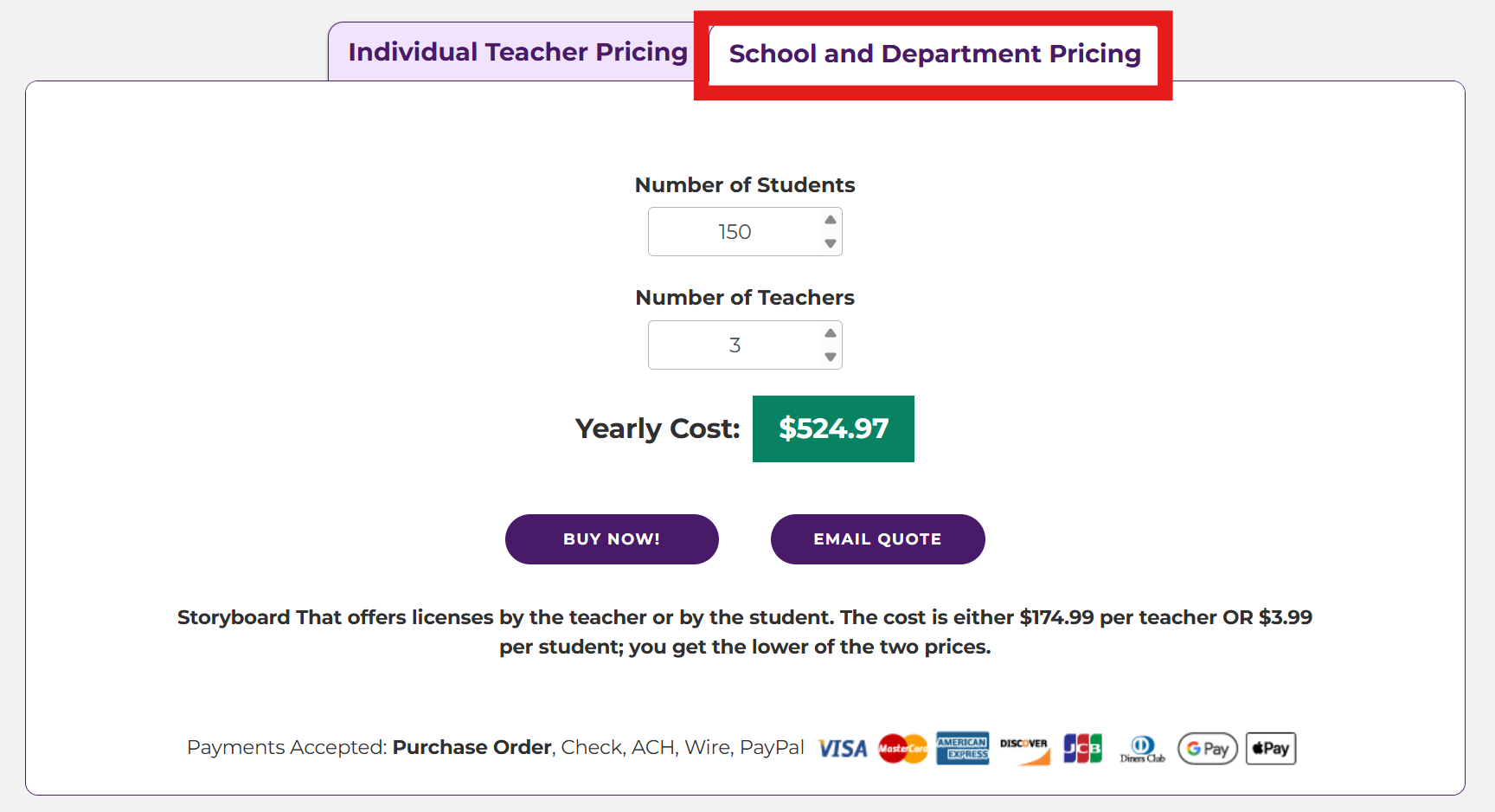 Have a quote emailed to you automatically, or send in a quote request to orders@storyboardthat.com.
