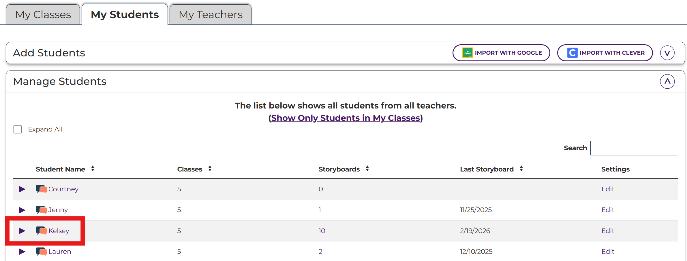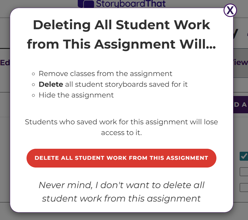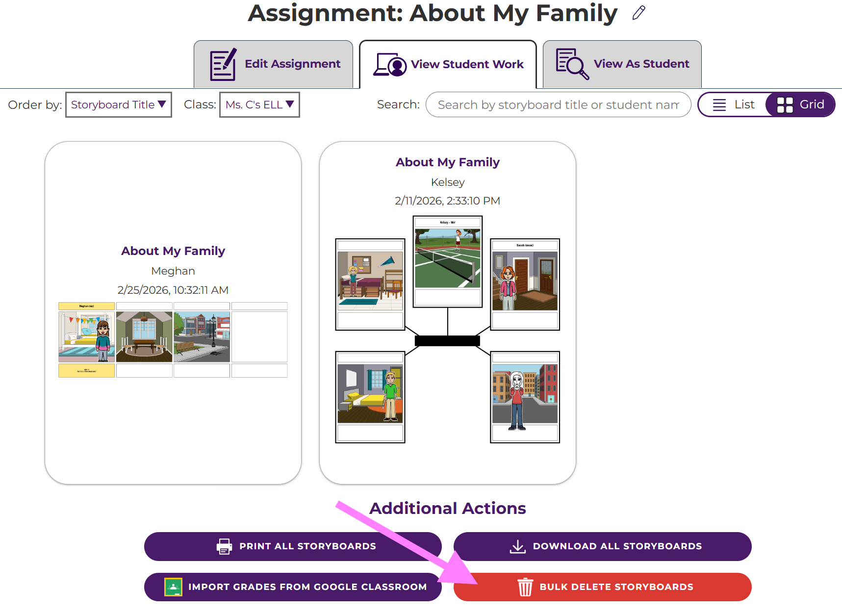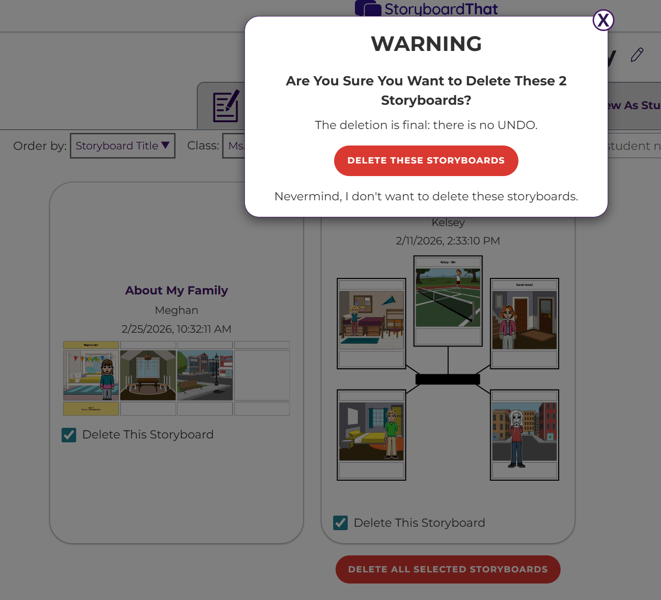 Teachers have the ability to delete their own storyboards, student storyboards, student accounts, assignments, and classes.