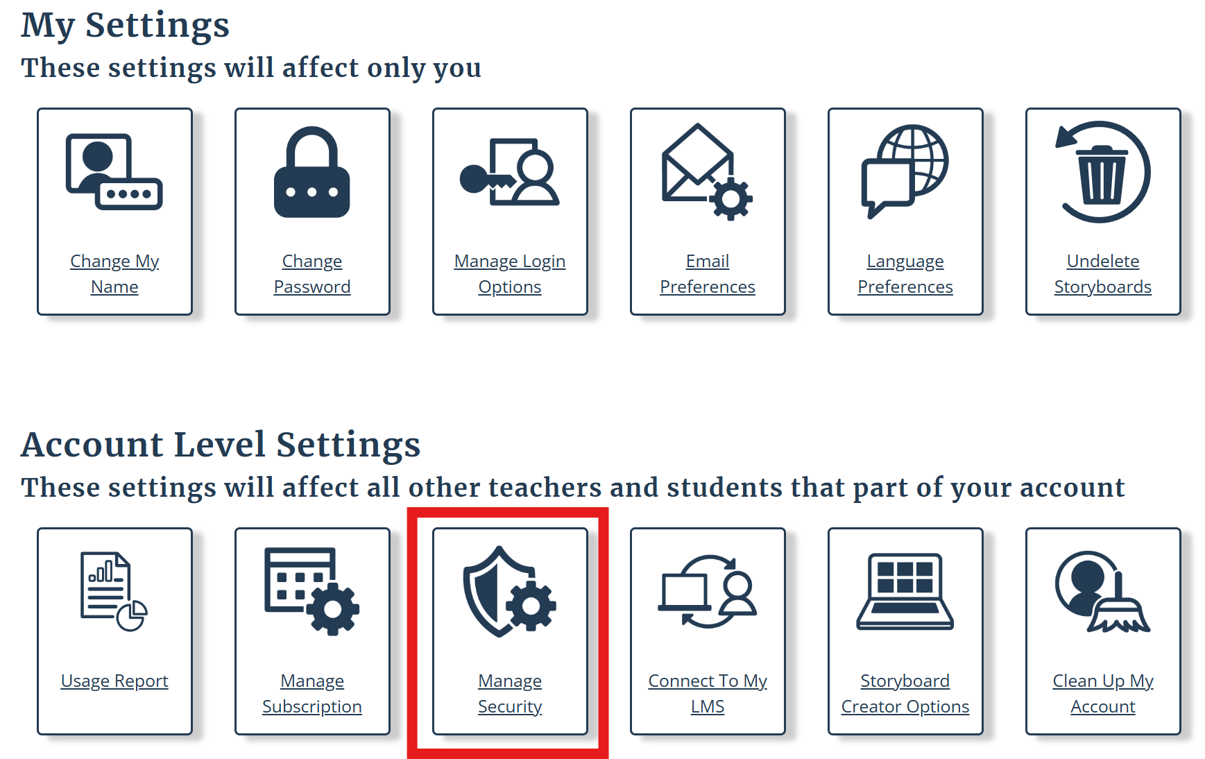 - Click Manage Security under Account Settings from the teacher dashboard.