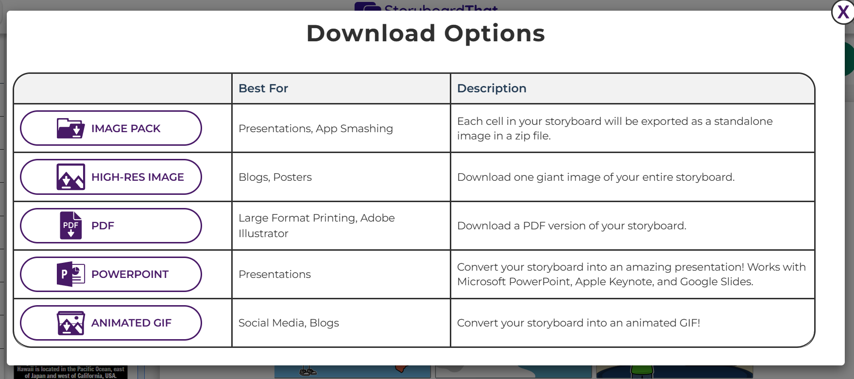 You can download a storyboard as a variety of file types in order to share them with anyone you'd like!