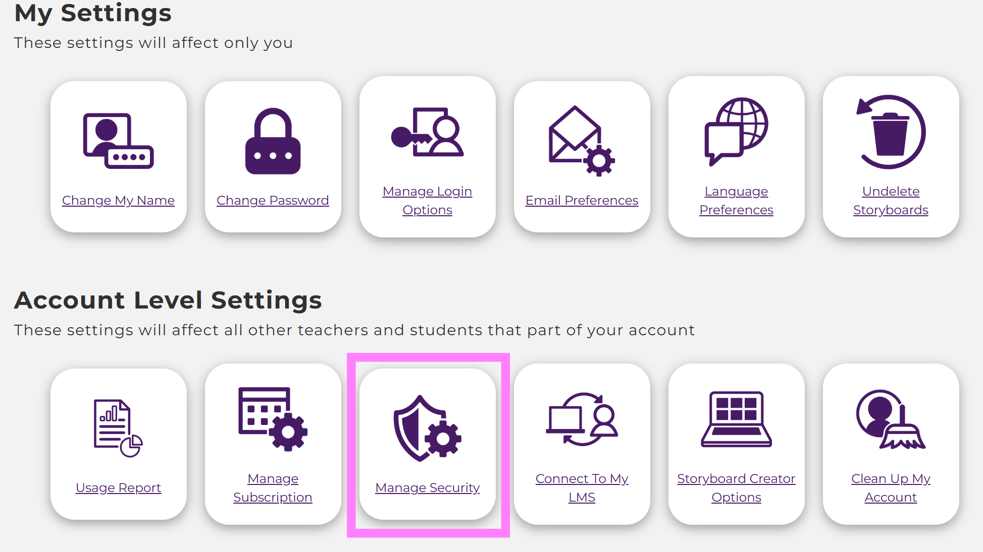 - From the teacher dashboard, click Manage Security under Account Settings.