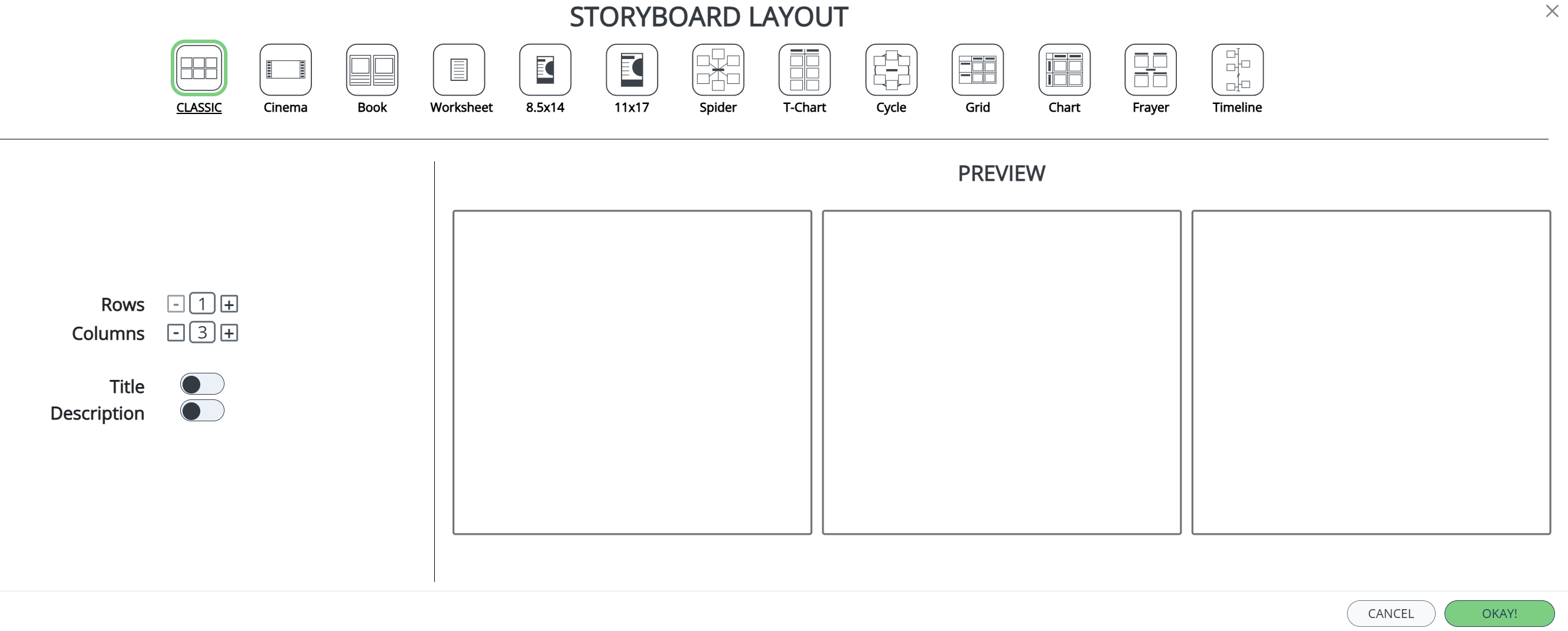 A window will pop up with several options for layout and cells. You will see a preview of your storyboard on the right as you make changes!