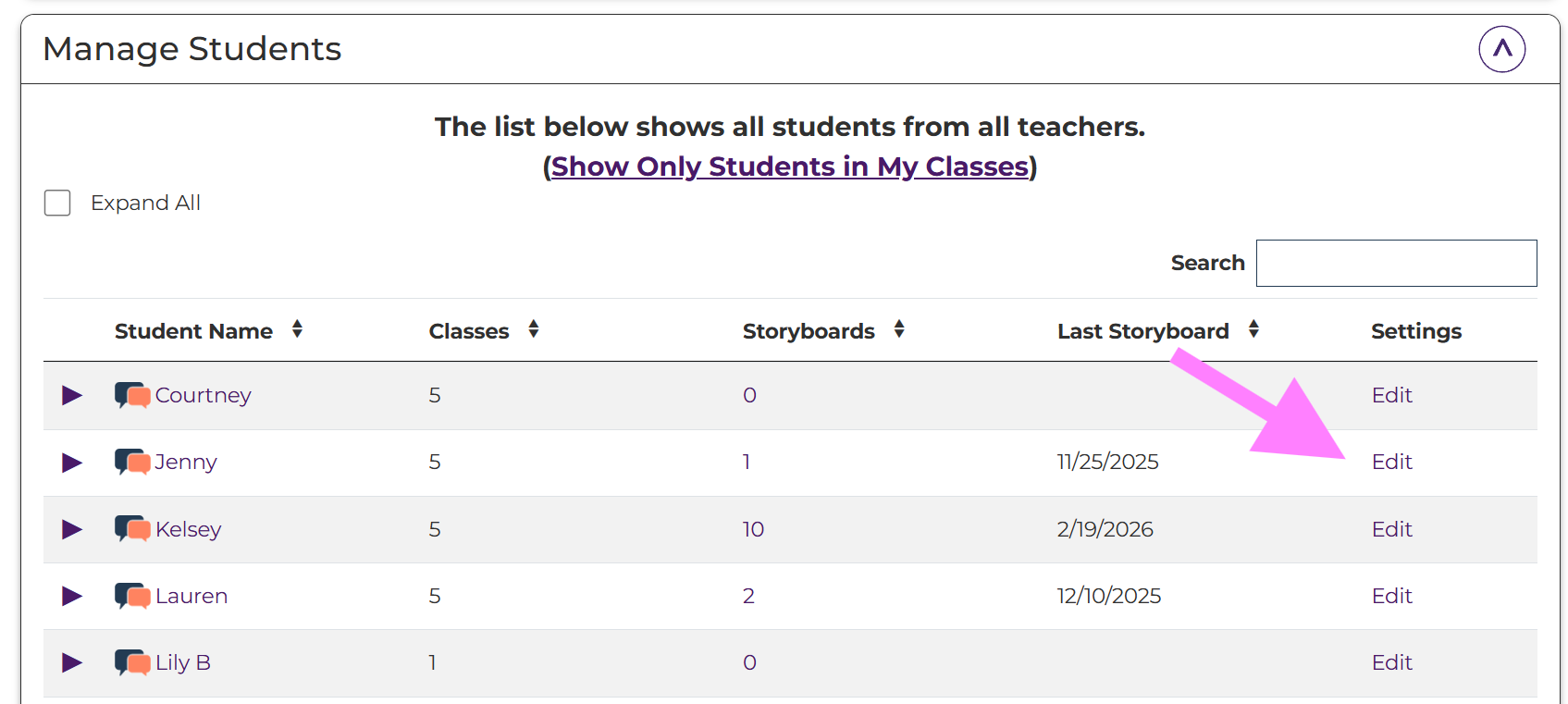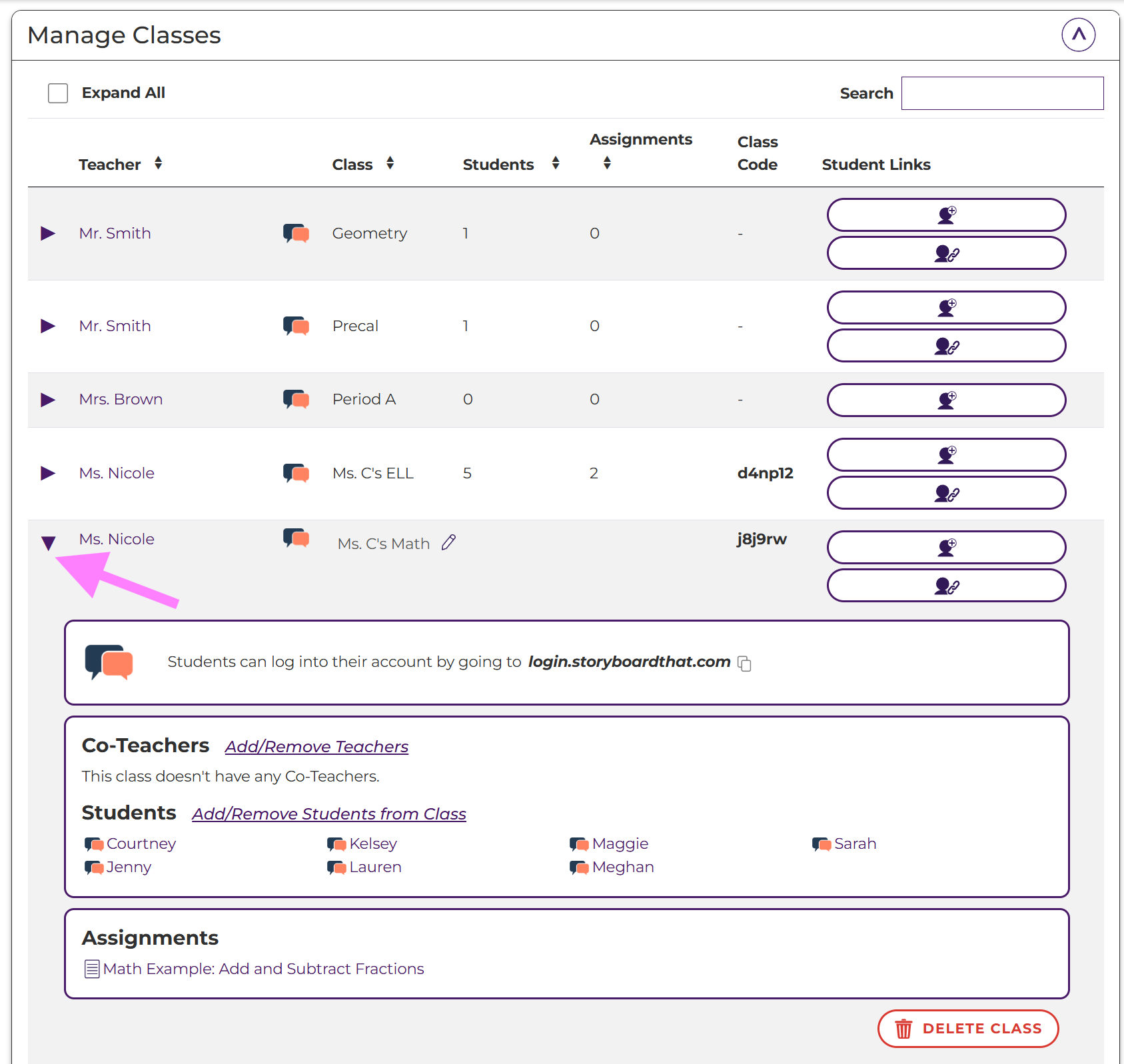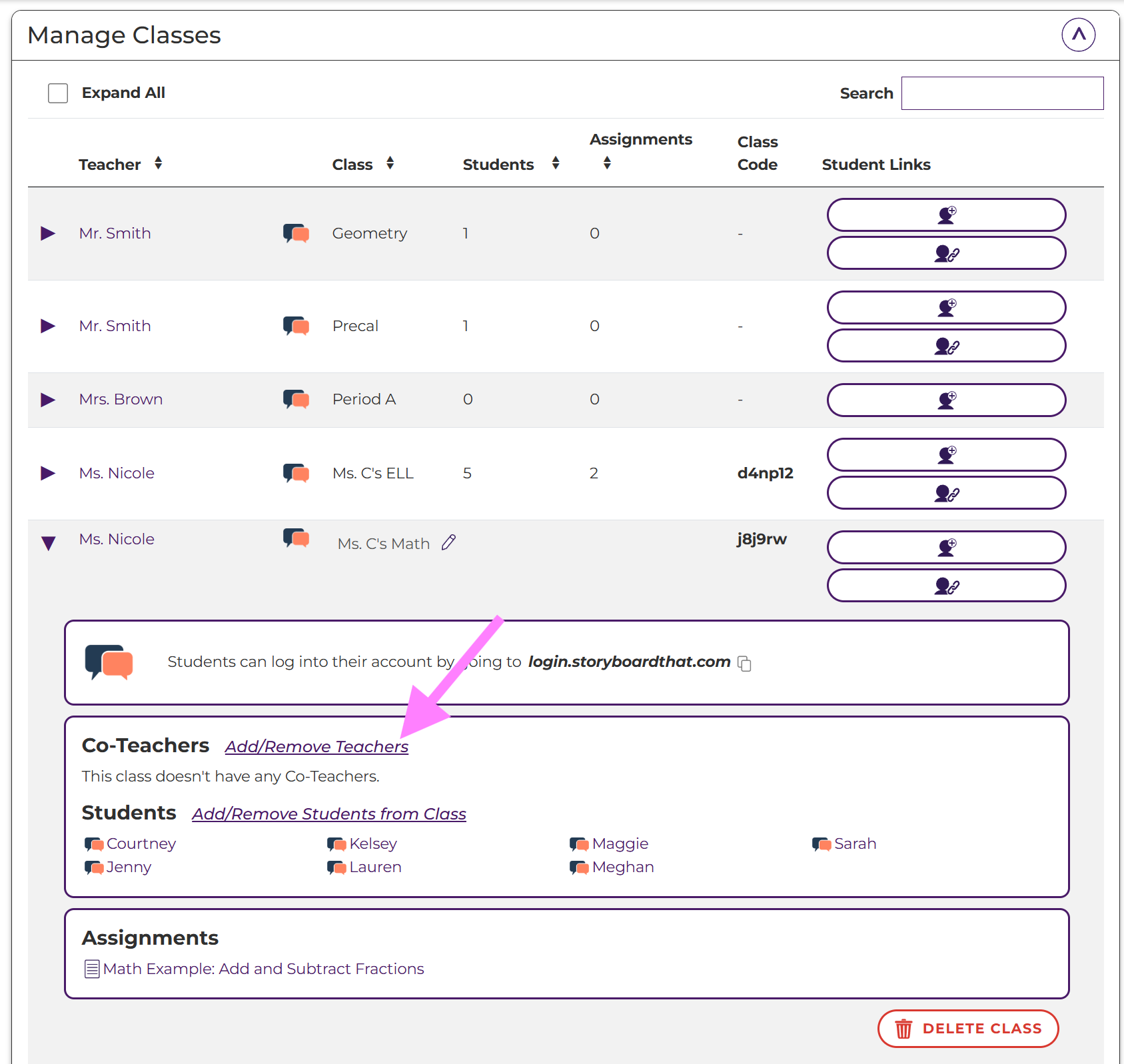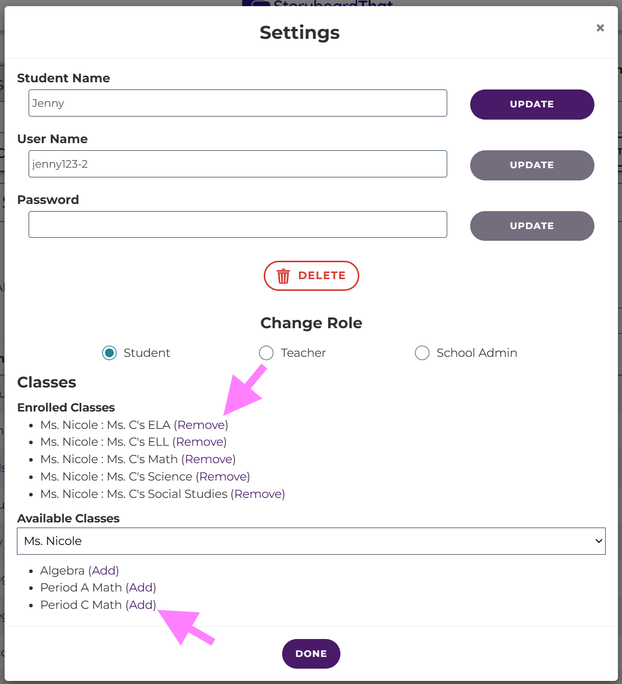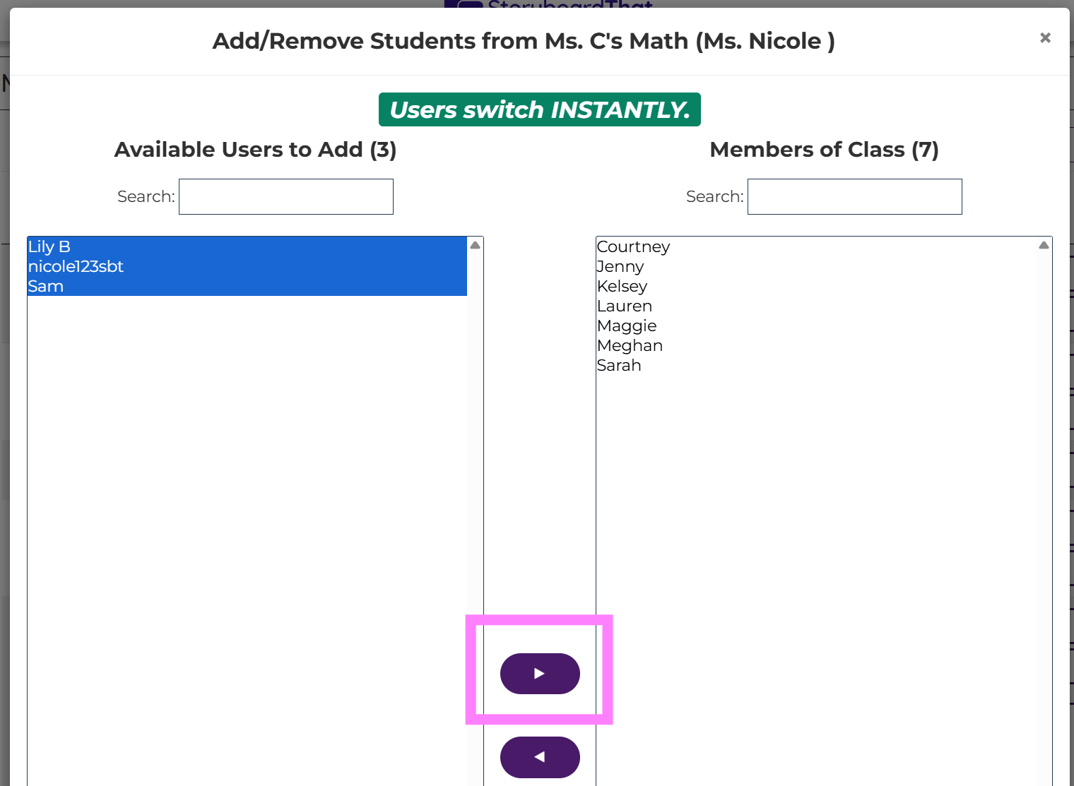 To add students, select their names on the left side and use the purple arrow to move them over to the right side. Use "shift" to select multiple students in a row. To select students who are not sequential, use the "command" key on a Mac or the "control" key on a PC.
