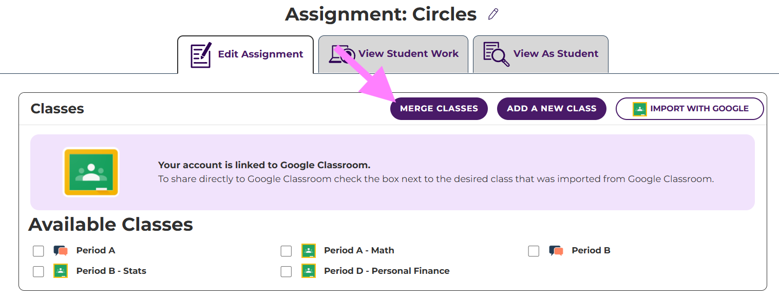 If you have classes rostered differently, you will see this merge classes button when you are in an assignment.