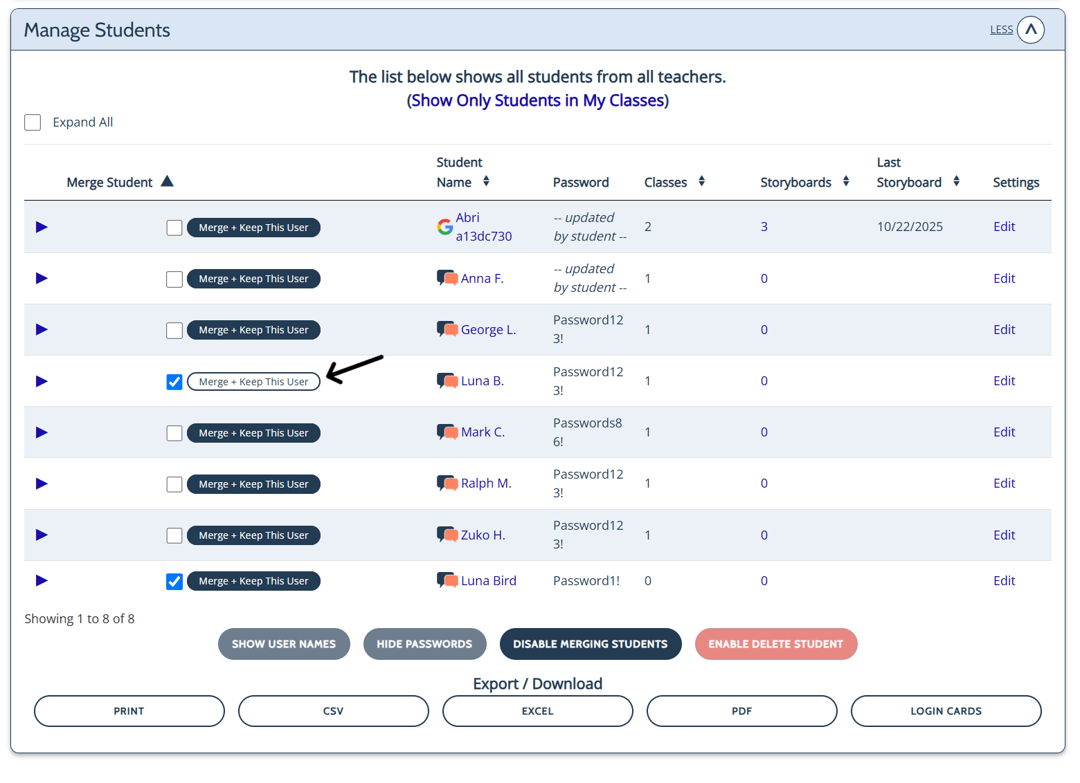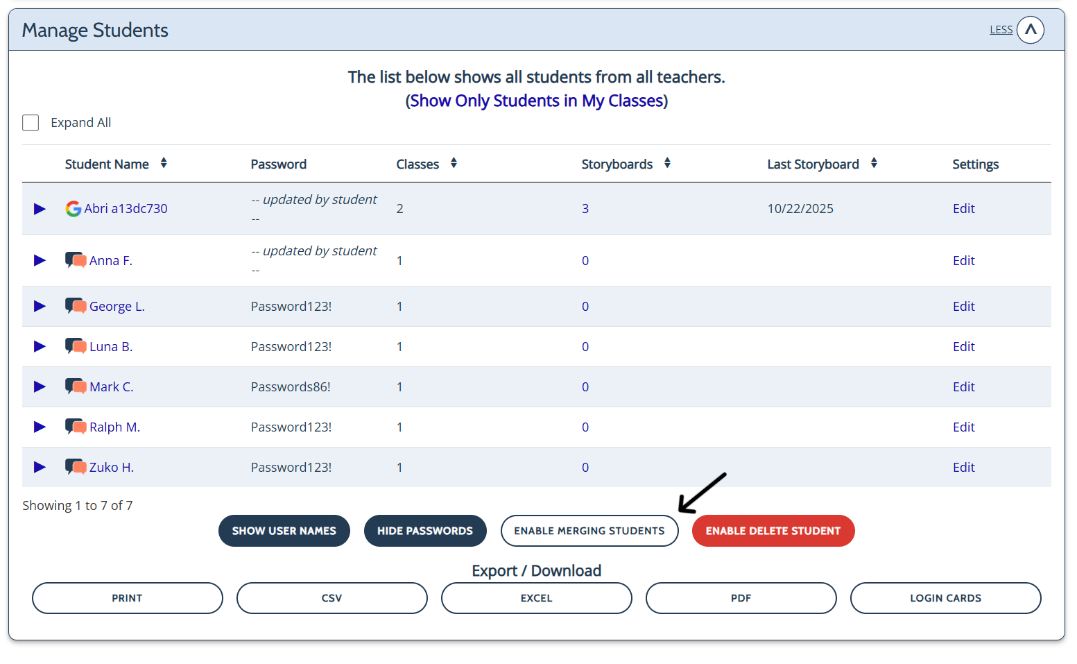 When you delete a student, that student and all of their storyboards will be deleted. There is no undo for this action. To avoid deleting students by mistake, the delete options are not available until you click the "Enable Delete Student" button.