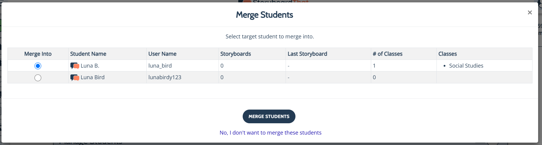 - A modal will pop up to confirm the merge. Make sure the information is correct and click "Merge Students"!