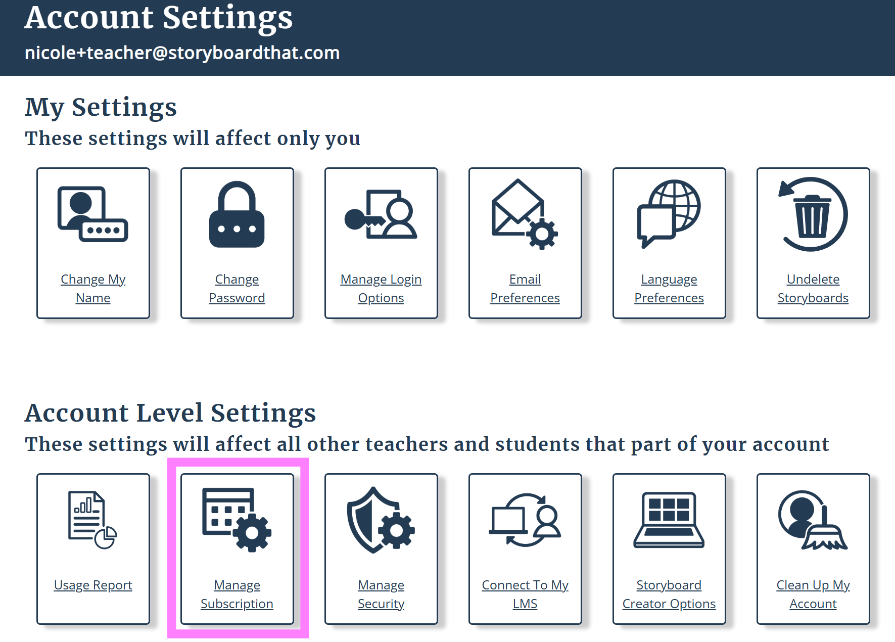 - Click Manage Subscription under Account Settings on your Dashboard